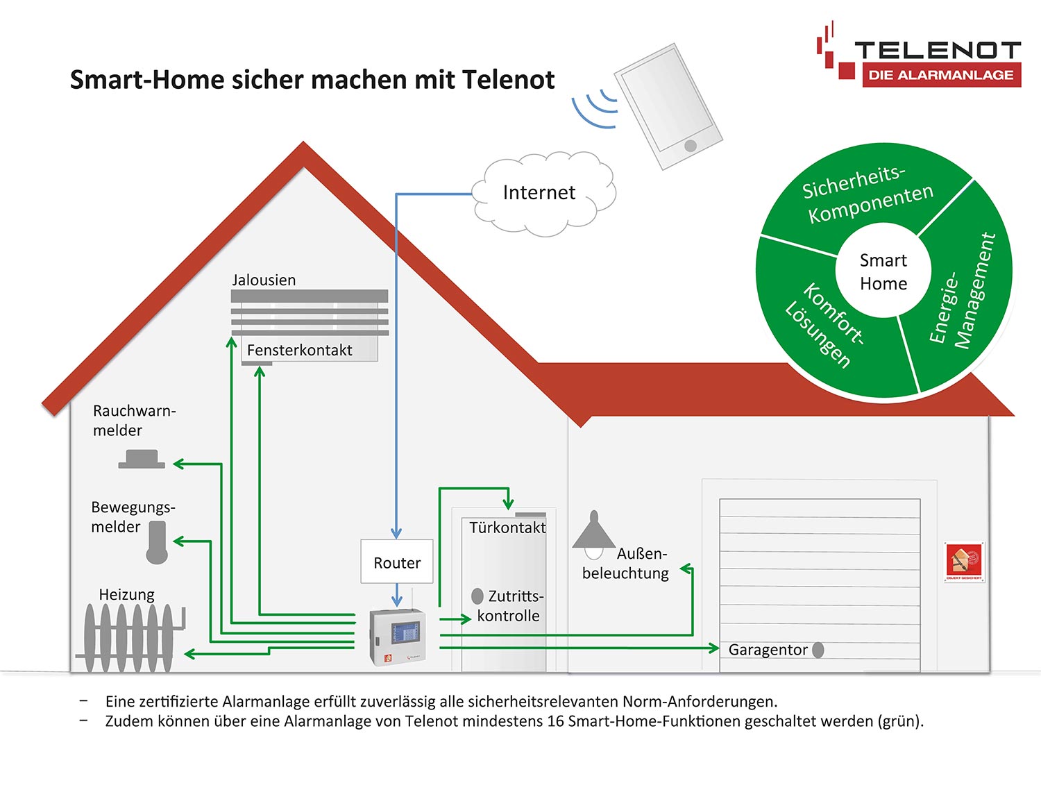 Smart-Home-Systeme und deren Komponenten sind in erster Linie für Komfort-Lösungen und Energie-Management im Haus entwickelt. Wird ein Smart-Home-System jedoch um sicherheitsrelevante Komponenten wie Bewegungsmelder, Glasbruchsensoren, Türöffnungskontakte, Türzutrittskontrollleser, Alarmsignalgeber oder Rauchmelder ergänzt, sprechen wir von einer Alarmanlage.